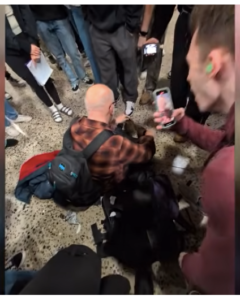 Tony Hall is the bearded man on the right, and in second photo he sits on the floor surrounded by the mob after all his papers have been snatched, torn and destroyed.